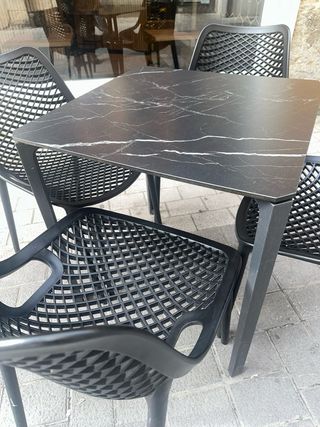 Conjunto de mesas y sillas para terraza o exterior. Diseño moderno estilo mármol, material resistente y duradero para cualquier espacio. 100€ cada pack (1 mesas y 4 sillas) - Mesa con sobre efecto mármol, 70x70cm. APILABLES. - Sillas de plástico con diseño calado, APILABLES. Aguantan sol y lluvias. 7 mesas y 28 sillas. Se venden en conjunto.