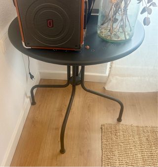 Mesa auxiliar redonda con un diseño moderno y práctico. Su estructura permite plegarla fácilmente para guardarla. - Tablero de metal. - Patas plegables.