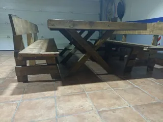 Conjunto de mesa rústica de madera con dos bancos. -Presupuestos sin compromiso para gente educada - Mesa grande con diseño de patas cruzadas. - Dos bancos a juego. - Se hacen por encargo diversas medidas consultar sin compromiso - Posibilidad de transporte propio - Más modelos en mi perfil