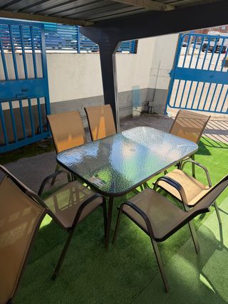 Mesa de jardín con superficie de cristal y estructura de metal. - Ancho de 1 metro y de largo 1,80,extensible hasta 2,40. - Junto con 6 sillas a juego - Diseño moderno y elegante.