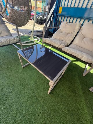 Se vende mesa baja de aluminio y ratán sintético, nueva a estrenar, en color beige natural, de la marca Naterial. Incluye su vidrio superior. Precio no negociable. Se entrega en mano en Valladolid en su caja original. No envío