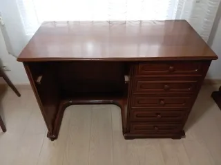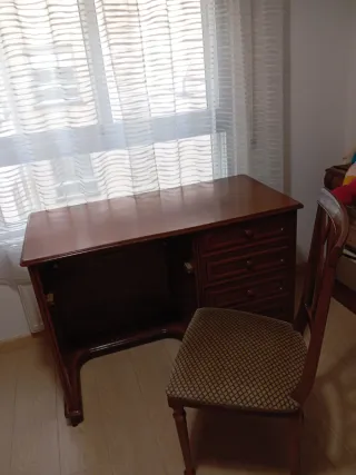 Mesa escritorio madera, creo que es nogal, con 5 cajones, esquinas redondeadas. Muy adecuado para formar parte de una decoración clásica. 111*55*80 cm de alto. Silla también clásica y de madera, parecido tono. Todo en muy estado. Transporte por cuenta del comprador. Recoger en Gamonal, Burgos, piso con ascensor.