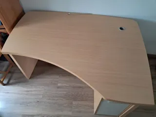Mesa de escritorio en buen estado. Ideal para oficina o estudio. - Superficie amplia y resistente. - Estructura metálica blanca. - Acabado en madera color beige.
