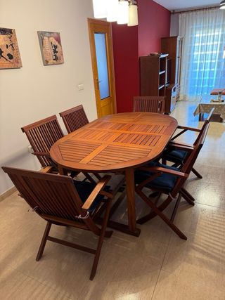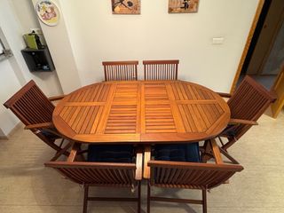 Conjunto de mesa ovalada y 6 sillas de teka para terraza extererio. Calidad muy alta. La mesa siempre ha estado en interior, por lo tanto, está en perfecto estado. Medidas mesa: 1,10m (ancho) X 1,75m(largo, extensible a 225 cm) X 0,75m (alto)