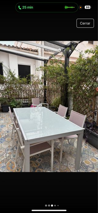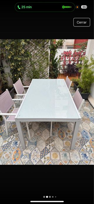 Conjunto de muebles de exterior en perfecto estado para disfrutar al aire libre. Incluye una mesa con tablero de cristal transparente y estructura de aluminio gris, además de seis sillas a juego. - Estructura de aluminio resistente y ligera. - Tablero de cristal templado, fácil de limpiar. Mesa 135 extensible a 200 cm mesa tiene algún desperfectos de oxido en la parte inferior de la mesa de estar en el exterior y una pequeña zona donde se ha levantado la capa de aluminio que cubre.