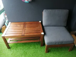 Conjunto de mesa y sillas de exterior IKEA, ideal para tu terraza o balcón. Se encuentra en perfecto estado. - Mesa de madera con diseño de listones. (30€) - Dos sillas plegables de madera.(15€) - Dos taburetes de madera. (10€) - Una de ella tiene una pequeña marca que apenas se aprecia Precio origina nuevo: 180€