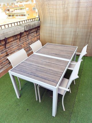 Conjunto de mesa y cuatro sillas. Mesa de Ikea con estructura de metal y soporte de sombrilla, con parte superior independiente (se puede cambiar) de madera. Las sillas son modelo Lea de Bauhaus en color crema / beige. La estructura de la mesa está en perfecto estado, la madera tiene un tono más calido pero aparece mojada por la lluvia en las fotos. Las sillas están en perfecto estado, sin marcas ni arañazos. Precio por separado: Sillas: 90€ por las cuatro Mesa: 50€ Precio del conjunto: 120€
