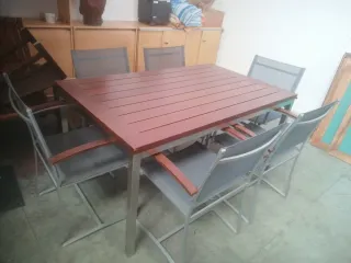 Conjunto de mesa de terraza con seis sillas. - Mesa con superficie de madera. - Estructura de las sillas y mesa de metal. - Sillas con asientos y respaldos de tela.