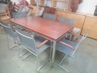 Conjunto de mesa y seis sillas para terraza. - Mesa con superficie de madera. - Sillas con estructura metálica y asientos de tela.