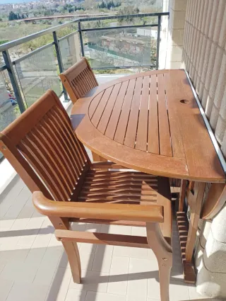 Conjunto de mesa redonda y dos sillas, ideal para tu terraza o jardín. Está todo en perfectas condiciones. La mesa mide 120 cm de diámetro y se puede plegar. Es madera de teca, pesada y muy resistente. Sólo recogida. Tarragona ciudad. Precio algo negociable.