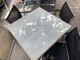 7 Mesas 80x80 color crema y gris imitación madera muy resistentes y en buen estado 135cada una cos sus 4 sillas sillas sueltas a 25€ mesa suelta a 60€