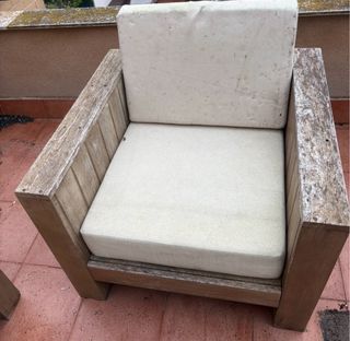 Conjunto de muebles para terraza hechos con palets de madera tratada. Perfectos para disfrutar del buen tiempo. - Incluye dos sofás y una mesa de centro. - Los sofás tienen cojines. - La mesa es de madera tipo palet. No esperes a verano!