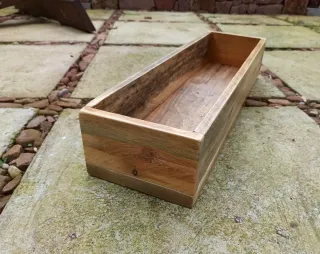 Centro de mesa tipo jardinera, hecho a mano con madera reutilizada, cuidando especialmente el acabado. Tratado para resistir la intemperie, ideal tanto para interior como para exterior. Diseñado para colocar pequeñas macetas, plantas, velas u otros elementos decorativos. Aporta un estilo rústico y natural a cualquier espacio: mesa, terraza, balcón o jardín. Medidas: Largo: 65 cm Ancho: 19 cm Alto: 12 cm Peso: 3 kg aprox. Sostenible 🌱 Fabricado con materiales reutilizados, dando una segunda vida a la madera. Pieza única, hecha con cuidado y dedicación.