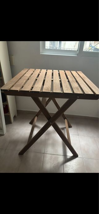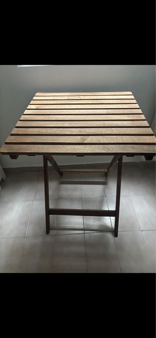 Conjunto de mesa y sillas de exterior IKEA, ideal para tu terraza o balcón. Se encuentra en perfecto estado. - Mesa de madera con diseño de listones. (30€) - Dos sillas plegables de madera.(15€) - Dos taburetes de madera. (10€) - Una de ella tiene una pequeña marca que apenas se aprecia Precio origina nuevo: 180€