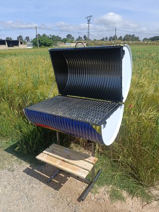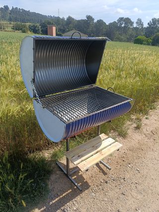 Barbacoa hecha con un barril de metal, pintada en azul y blanco. Tiene una estructura resistente y una rejilla para cocinar. Incluye una pequeña mesa de madera. Ideal para barbacoas al aire libre. - Perfecta para jardines o terrazas. - Diseño único y llamativo.