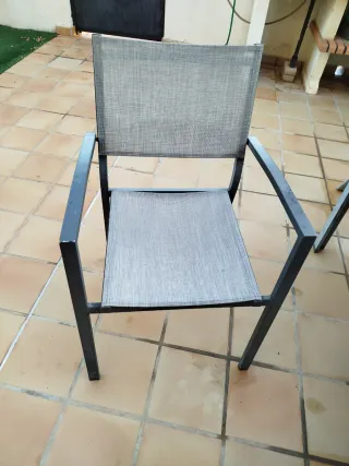 Conjunto de mesa, cuatro sillas y dos butacas multiposicion Exterior, terraza, jardín - Mesa aluminio gris con cristal negro - Sillas aluminio con asiento textileno (tela plástica exterior) Está algo deteriorado, d ahí su precio