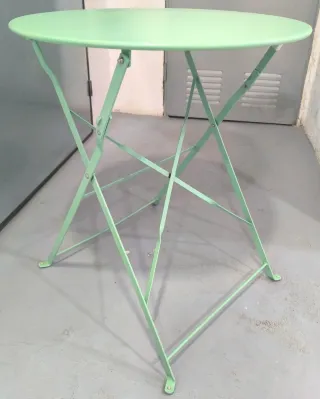 Conjunto de mesa y 2 sillas plegables de la marca Sklum. Ideales para espacios pequeños o terrazas. Son de color verde menta y tienen un diseño sencillo y elegante. - Estructura metálica. - Plegables para fácil almacenamiento. - Color verde menta. - Tienen alguna señal de uso ver fotos