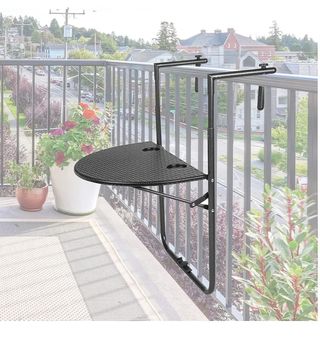 Mesa metálica diseñada para colgar en barandillas de terrazas o balcones. Su diseño permite aprovechar el espacio exterior. Además tienen hecha una adaptación para barandillas estrechas que se le puede quitar. Tengo 2. Precio en Amazon 59 euros - Estructura de metal. - Acabado en gris.