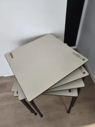 Se vende por mudanza, conjunto de mesas para terraza o interior. Su estado es para restaurar lijado y barnizado Se pueden usar como estantería o almacenaje Por su forma se pueden poner en una esquina o juntas como modulo