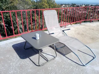 Conjunto de mesa y dos sillas plegables, ideal para balcones o terrazas pequeñas. Su diseño permite guardarlo fácilmente. - Estructura de metal. - Tablero y asientos de madera. Medidas de la mesa 56x40 cm Las medidas de las sillas pueden consultarse en la última imagen. Nótese que el color de la madera de las sillas y la mesa es diferente porque son de marcas diferentes aunque combinan bien. Zona de recogida cerca de la parada de metro de Joanic