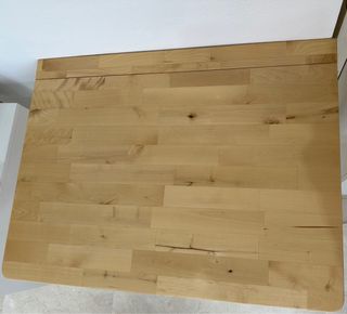Mesa plegable de madera, ideal para espacios reducidos o para tener un extra de superficie cuando lo necesites. Su diseño sencillo se adapta a cualquier ambiente. - Superficie lisa y fácil de limpiar. - Bordes redondeados para mayor seguridad. - Mecanismo de plegado sencillo. Tiene dos arañazos ,no se aprecia mucho ,pero no impide nada su funcion precio negociable .
