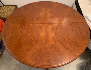 mesa redonda de madera extensible,adquiere forma ovalada,en la foto está extendida.Color cerezo en perfecto estado.medida extendido 114cm,recogida 84cm aproximadamente Tengo 4 sillas a juego y un sofá uniplaza.Todo en perfecto estado y de calidad. Ideal para amueblar pisos de alquiler