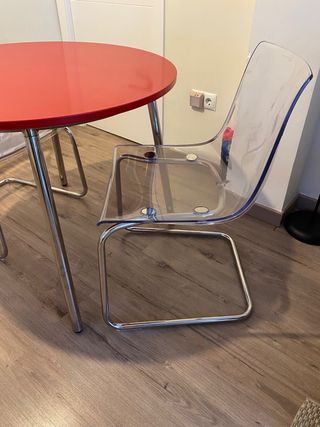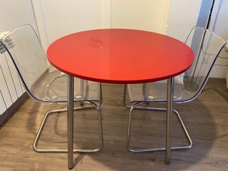 Mesa redonda roja + 2 sillas transparentes