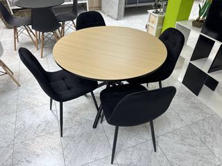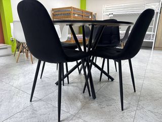 Conjunto de mesa redonda y cuatro sillas. - Mesa con sobre negro. - Sillas de diseño moderno con patas de madera. Medida: 100cm 610*275*398* -whast app!