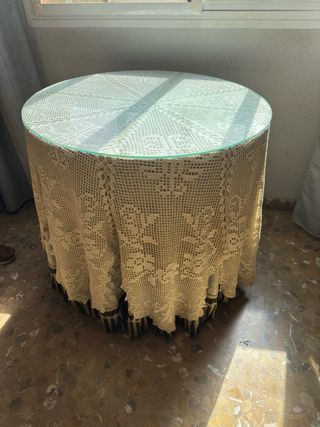 Elegante mesa redonda con cristal. - Mantel de encaje. - cristal transparente. 80cm de diametro y 74cm de altura