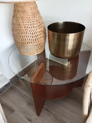 Elegante mesa auxiliar con estructura de bambú y tapa de cristal. - Diseño redondo. - Materiales naturales y resistentes. - Ideal para cualquier rincón.