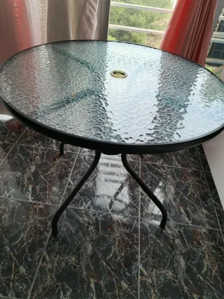 Mesa redonda para exterior con superficie de cristal y estructura metálica. - Diseño moderno y funcional. - Ideal para patios y jardines.