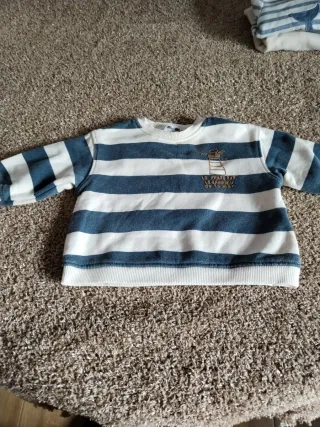 Jersey de punto para bebé de 18 meses con un bonito diseño nórdico. - Color base crudo. - Estampado de grecas en tonos mostaza, azul marino y verde menta. - Cuello redondo. - Cierre con dos botones en el hombro. SOLO 1 USO