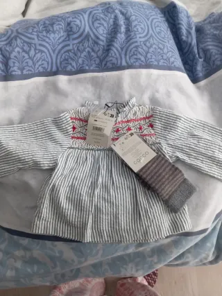 Conjunto de ropa para bebé con estampado de rayas finas. Incluye una blusa de manga larga con detalles bordados en color rosa y un par de calcetines a juego. - Blusa con cuello redondo y mangas largas. - Bordado decorativo en el pecho. - Calcetines con puño elástico.