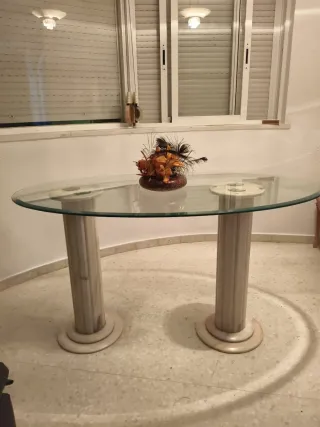 Elegante mesa con sobre de cristal y base de dos columnas de mármol. - Diseño moderno y sofisticado. - Materiales de alta calidad.