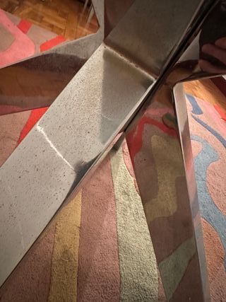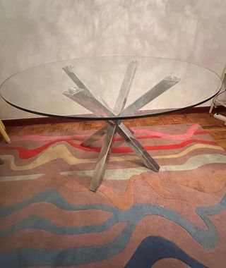 Elegante mesa de cristal y base de acero cromado. están hechas de acero cromado brillante y resistente, y su tapa es de cristal templado transparente. Seis comensales. Acero un poco dañado en algunas partes, imprescindible recoger. Medidas: 119 (ancho) x 75,5 (alto) x 119 (largo) cm Diámetro: 119 cm
