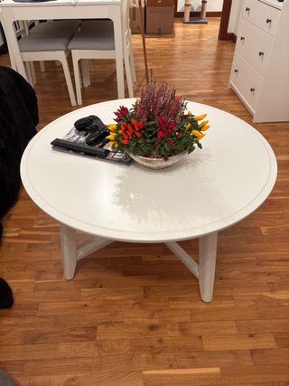 Elegante mesa de centro redonda de Ikea. Está practicamente nueva, se vende por mudanza. El diseño ligero y de líneas depuradas de la mesa de centro LISTERBY permiten combinarla fácilmente con otros muebles. La superficie inferior aporta ligereza a la mesa y es ideal para revistas, mandos a distancia y todo lo que quieras tener a mano. La madera de haya es un material natural resistente. Altura: 37 cm diámetro: 90 cm Altura: espacio bajo el mueble: 12 cm Peso máximo: 20 kg Peso máximo/balda: 10 kg
