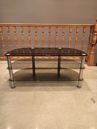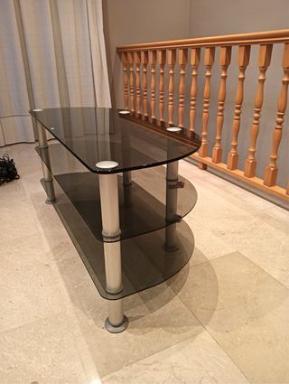 Vendo mueble para TV o equipo multimedia con diseño moderno en cristal templado oscuro y estructura metálica en aluminio. Muy resistente y elegante, ideal para salón. Tiene 3 niveles: • Parte superior para TV • 2 baldas inferiores para consola, router, deco, etc. Se encuentra en muy buen estado, sin golpes ni roturas. Medidas aproximadas: (puedes añadirlas si quieres afinar más). Perfecto para darle un toque moderno a cualquier espacio. precio negociable