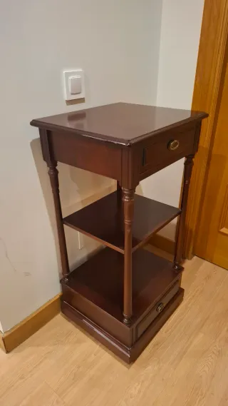 Elegante mesa auxiliar de madera con un acabado en color caoba. Perfecta para añadir un toque clásico a tu hogar. Sirve de soporte para tv de dormitorio ya que es de 95cm de alto y tiene ruedas. - Diseño de tres niveles. - Un cajón superior con tirador dorado. - Base sólida y patas torneadas. - Ruedas