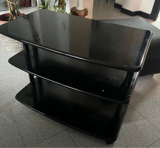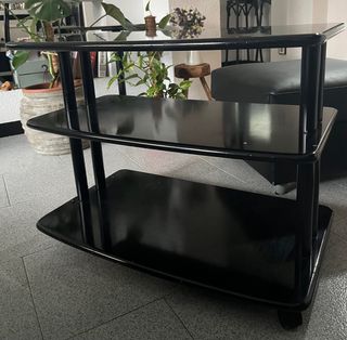 Mesa de televisión de color negro, fabricada en madera y plástico. Es una pieza compacta y práctica con ruedas para desplazarla fácilmente. Medidas: 80x40x60cm - Perfecta para colocar tu televisor. - Dispone de dos estantes para guardar equipos multimedia. - Se encuentra en buen estado, con algunas marcas de uso mínimas.