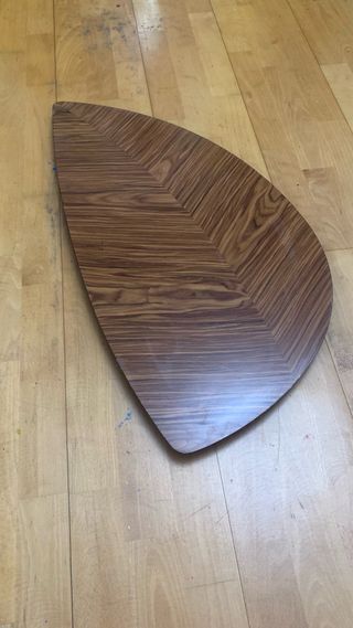 Tablero de mesa de salón con un diseño orgánico y acabado en madera. - Forma de hoja o lágrima. - Patrón de vetas de madera distintivo. - Ideal para proyectos DIY o como pieza decorativa.