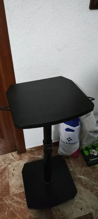Mesa auxiliar con base estable y altura regulable. - Bandeja superior con soportes laterales cuya función principal era agarrar la televisión (estos soportes laterales se pueden quitar) - Ruedas para facilitar su movilidad. Se ha usado muy poco así que está en perfectas condiciones y es bastante útil