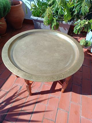 Elegante mesa auxiliar con un diseño árabe y un acabado dorado. - Superficie redonda con intrincados grabados. - Patas de madera tallada.
