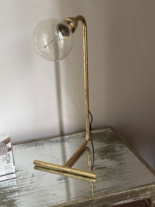 Elegante lámpara de mesa con un diseño moderno y sofisticado. - Estructura principal fabricada en metal con acabado dorado. - Pantalla esférica de cristal transparente.