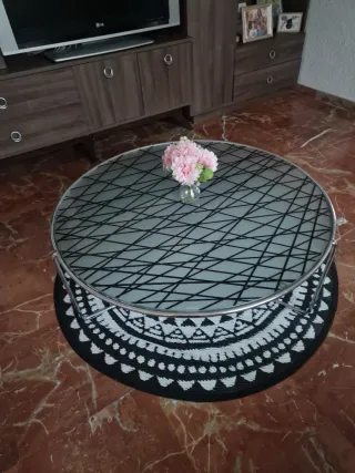 Elegante mesa de centro con un diseño moderno y llamativo. Su superficie de cristal transparente presenta un patrón geométrico en negro, y su estructura metálica le confiere estabilidad. - Diseño con líneas cruzadas en negro sobre cristal. - Base y estructura de metal. - Forma redonda.
