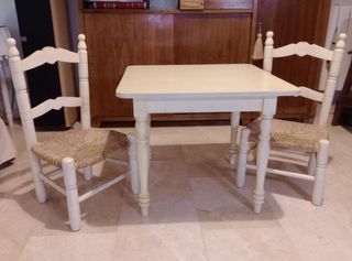 Conjunto artesanal de mesa y dos sillas infantiles con asientos de nea. - Mesa de color marfil. - Sillas con estructura de madera en color marfil y asientos de nea. - Ver medidas de cada elemento en las fotos adjuntas - No se hacen envíos, sólo recogida en persona.