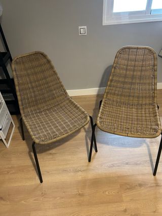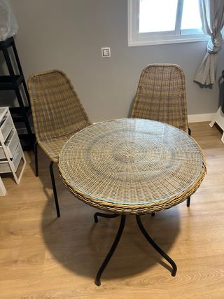 Conjunto de mesa redonda con tapa de cristal y dos sillas de mimbre, ideal para terrazas o balcones. - Estructura de las sillas y mesa en mimbre. - Tapa de mesa redonda de cristal. - Patas de la mesa de metal.