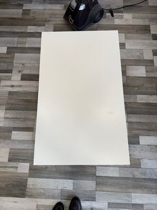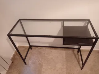 Mesa de escritorio con un diseño moderno y funcional. - Estructura robusta de metal. - Superficie de madera. - Color negro y multicolor. Mesa bastante cuidada , le retire la tablilla superior para que cupiera mi ordenador