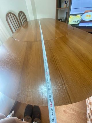 Vendo mesa de madera de alta calidad, robusta y en muy buen estado, ideal para comedor o reuniones. Es extensible con dos alas plegables independientes que permiten usarla en tres posiciones según el espacio. Medidas: 151,5 cm cerrada y 240 cm abierta, ancho 86 cm, forma ovalada. Muy estable gracias a su base sólida, con diseño elegante y apertura fácil. Gran capacidad para varias personas. Incluye mesa y 6 sillas de madera a juego con asiento acolchado. Ideal para salón, cocina o casa de campo. Estado: Buen estado general Entrega: Recogida en persona. Precio algo negociable según si no se quieren todas las sillas.