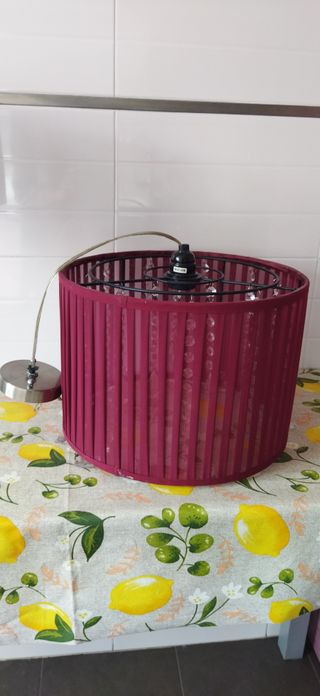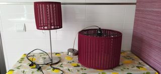 Conjunto de dos lámparas, una de techo y otra de mesa, con pantallas de tela en color burdeos. - Pantallas de tela plisada. - Estructura metálica. - Diseño moderno.