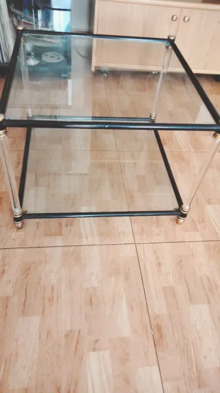 mesa de centro con superficie de cristal y estructura metálica. - Diseño con detalles dorados. - Patas de plástico transparente.